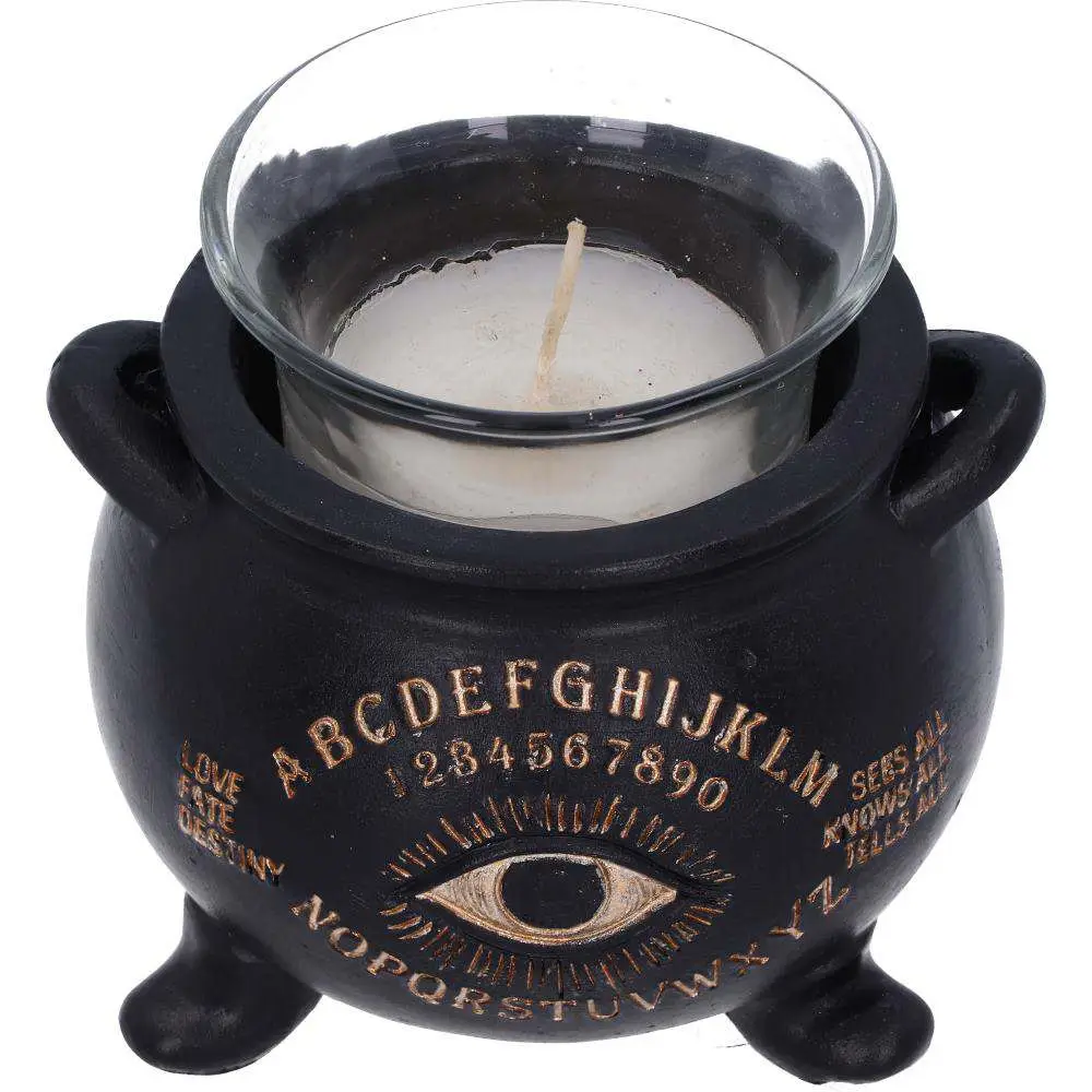 Questo piccolo calderone portacandele e' il sogno di ogni appassionato di occulto. Con un piccolo portacandele in vetro, questo calderone ha una finitura nera opaca e presenta un occhio onniscente dorato al centro. Decorato con le lettere e i numeri della tavoletta Ouija, il calderone ha le parole 'Love, Fate, Destiny' e 'Sees all, Knows all, Tells all ' che fiancheggiano l'occhio. Realizzato in finissima resina, questo pezzo sarebbe l'aggiunta perfetta a qualsiasi altare oscuro.