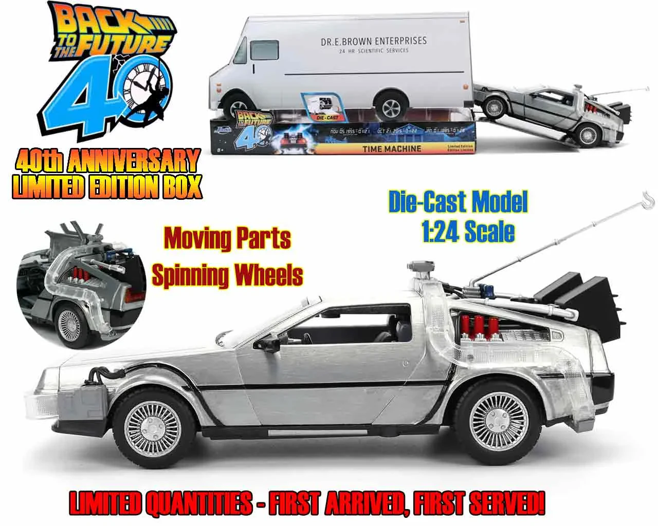 Dal primo capitolo della saga, la macchina del tempo più amata del mondo in una confezione speciale creata appositamente per il 40mo Anniversario del film che riproduce il furgone del dottor Brown.
