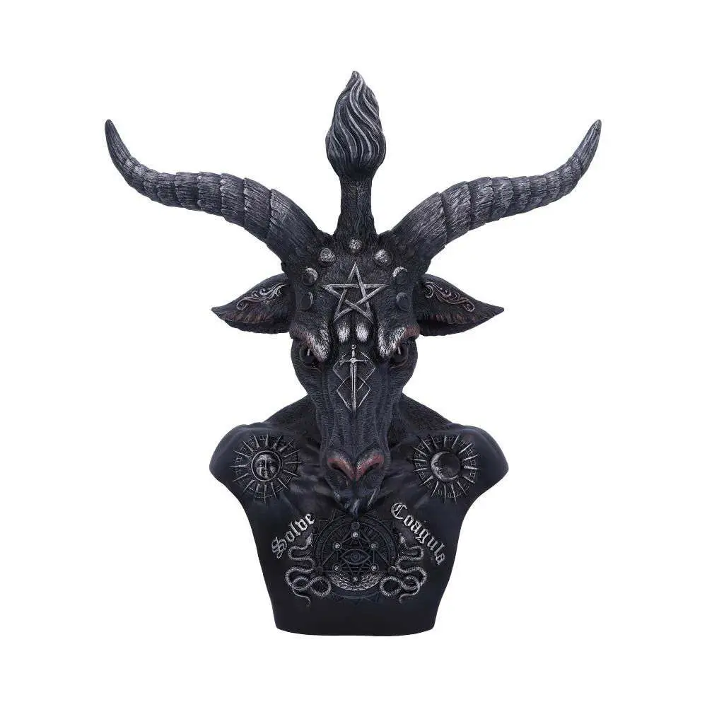 Baphomet rappresenta il simbolismo dell’equilibrio degli opposti, dell’eresia del libero pensiero e della conoscenza proibita. In questo busto ha una torcia tra le sue corna e un pentagramma sulla fronte, che rappresentano la scienza e il misticismo. Il suo petto mostra le parole latine SOLVE (separa) e COAGULA (unisci insieme), sul petto ci sono due serpenti che rappresentano il Maschile e il Femminile, sulle sue spalle ci sono il Sole e la Luna – i poteri di ’legare e sciogliere’ che incarnano gli opposti e celebrano contrasti.