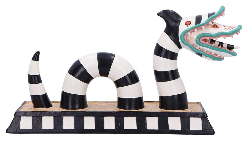 The Beetlejuice Sandworm Figurine is a must-have collectible for fans of Tim Burton’s cult classic. Featuring intricate hand-painted details, a bold black and white striped design, and the creature’s signature dual heads, this figurine is made from high-quality resin and features a stable display base. It’s packaged in a vibrant, officially licensed Beetlejuice box, perfect for display or gifting. Ideal for horror enthusiasts, movie buffs, and collectors of quirky pop culture, this figurine adds a spooky touch to any shelf. Bring home a piece of the Neitherworld and show off your love for all things strange and unusual.