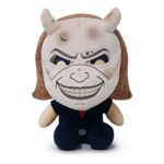 Now it’s your turn to grab The Grabber with his plush debut! Sitting at 9 inches tall with a nightmare-inducing smile curling across his stained mask and furrowed eyebrows resting over hollow eyeholes, a pair of short horns pokes out from the top of the mask, as light brown hair falls from his head to flick out in sharp points above his shoulders. Dressed in a black shirt that matches his pants and shoes, the red shirt underneath is viewable from the open neck as a grey belt buckle rests on his waist. This plush is packed to the seams with 100% PP cotton and is made of the softest minky material with accents of felt, absolutely perfect for cuddling or answering the phone with!