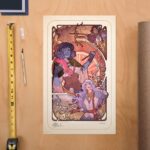 Three characters, each varied in personality, abilities, and history, stand connected by one player and the threads of fate woven across Exandria. At the top of the print, nimble Vex’ahlia takes aim and proves why they call her Grand Mistress of the Grey Hunt. In the center, the bubbly blue mischief-maker Jester Lavorre leaves a little reminder that “the Traveler was here,” for those looking to open their hearts to chaos. Below, prodigy spellcaster Imogen Temult seeks to understand the origins of her arcane abilities, framed by lightning from her fingertips. This intricate composition features incredible details from throughout Laura Bailey’s time at the Critical Role table, giving fans a chance to relive the excitement and action of 10 years of storytelling.