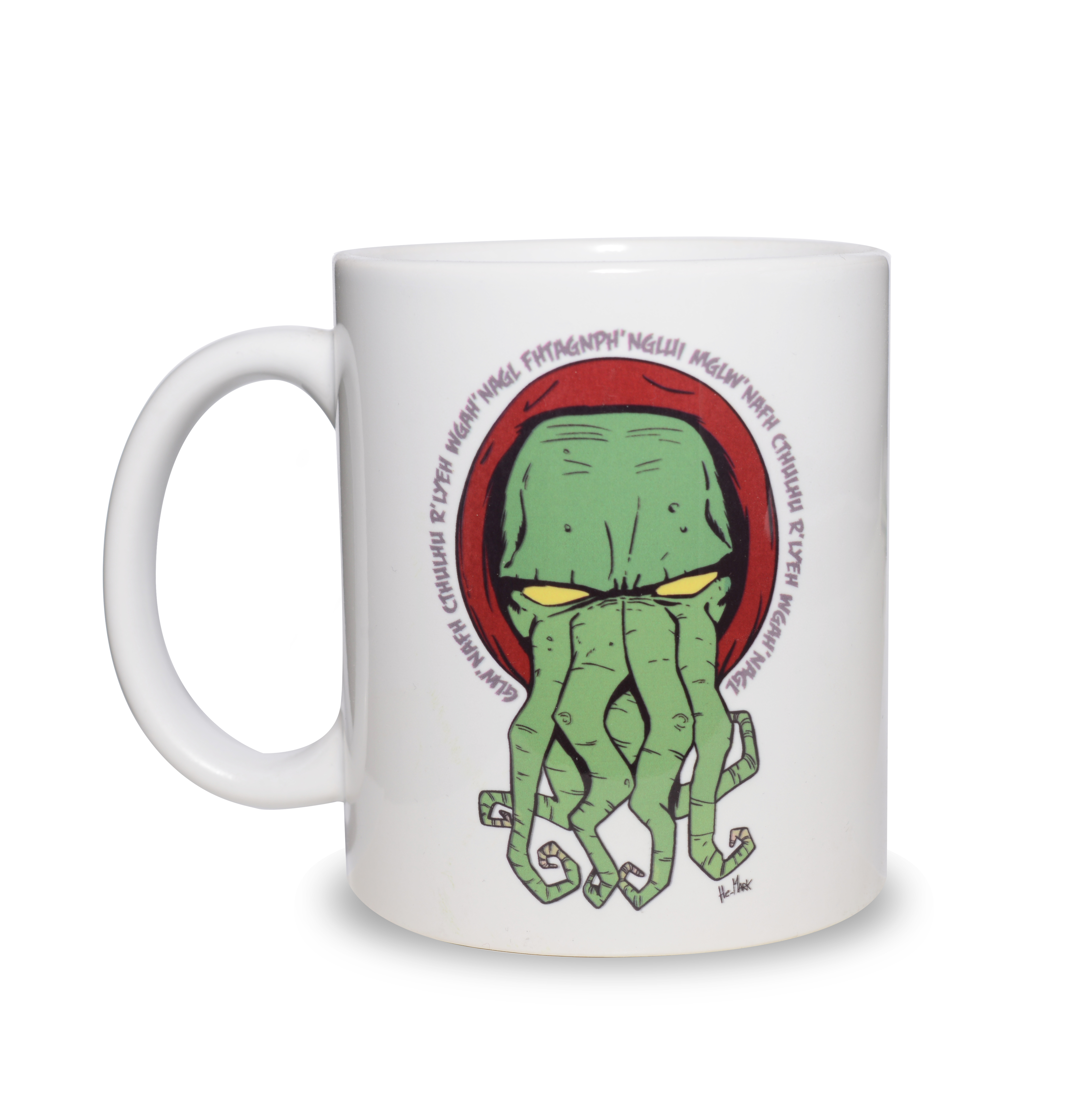Tazza raffigurante il Grande Cthulhu contornato dalla mitologica frase di evocazione (l’utilizzo della quale è strettamente a vostro rischio e pericolo.)