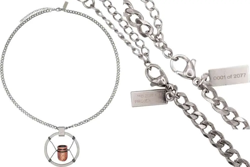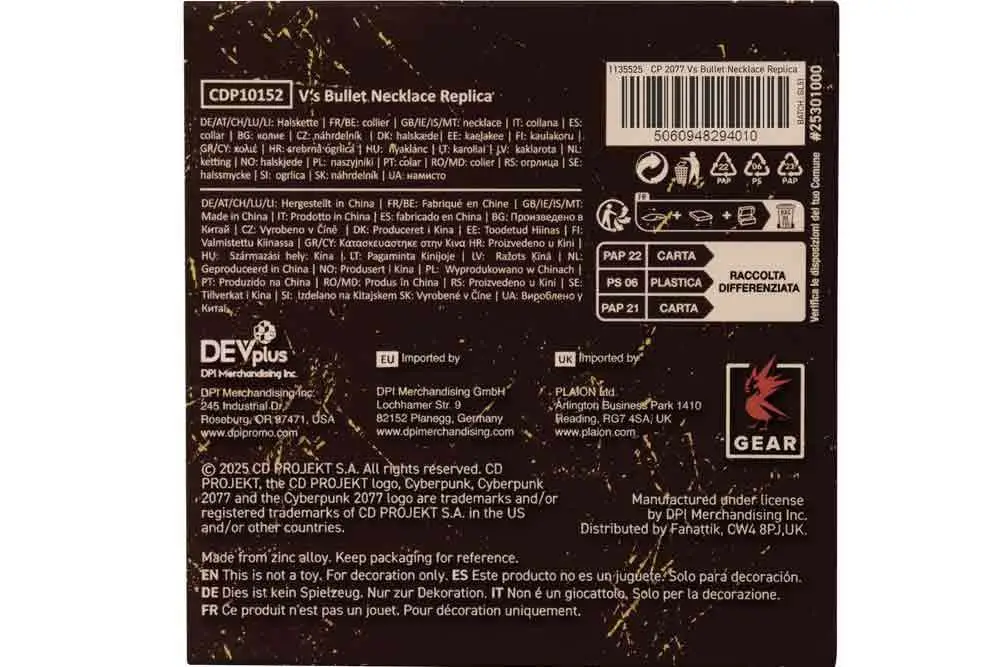 Questa replica dell’iconico ciondolo proiettile di V è limitata a 2077 pezzi in tutto il mondo, ciascuno numerato individualmente.