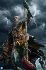 Inspired by the character’s comic book appearance, the fully sculpted DC statue presents an eerie guardian covered in crustaceans, fish scales, and other cold-blooded components. Distressed metallic paint on his rusted armor echoes a shipwreck long forgotten in the cold, unforgiving ravines of the ocean floor. Aquaman wields a weathered gold trident while he marches forward, braced for battle and bearing all the scars of his past. A red squid joins him from fathoms deep, and as the hero’s own green tentacles join it, man becomes myth … becomes monster.