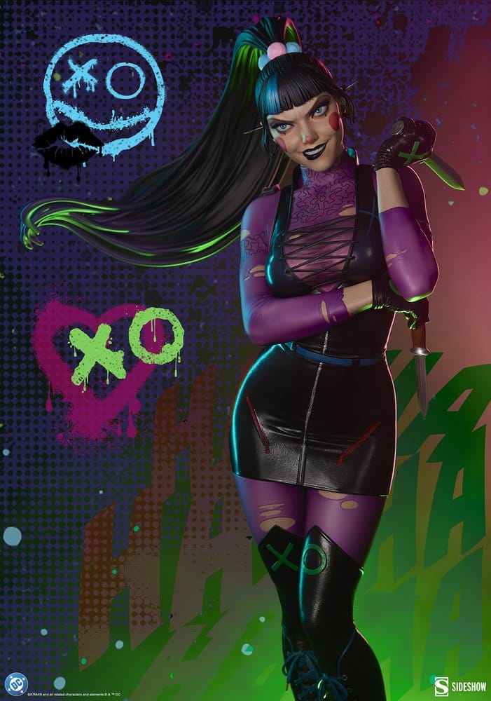 Sideshow and Warner Bros. Discovery Global Consumer Products (WBDGCP) present the Punchline™ Premium Format™ Figure. This officially licensed DC-themed collectible paints a cunning clown groupie in a chaotic, colorful light. It’s a mad world, and she’s the solution. The Punchline Premium Format™ Figure measures 21.75 inches (55.2 centimeters) tall, 11.14 inches (28.2 centimeters) wide, and 8.1 inches (20.5 centimeters) deep as Alexis Kaye carves out a place for herself within the coterie of Gotham City baddies. Both a lover and a hater, she takes her costume and makeup cues from The Joker™ while torturing torn toy versions of Harley Quinn™ and Batman™ — hey, every fangirl needs a hobby. Inspired by the character’s appearance in The Joker War story arc, this fully sculpted comic book collectible depicts Punchline in a ripped purple bodysuit, black dress and corset bodice, knee-high black boots, and a small black cape. She wields her preferred weapon in her right hand while standing upon a circular pedestal resembling wooden baseboard and tarnished brass. The quarter scale DC statue includes two portraits: one neutral and enigmatic, the other devious, revealing the pleasure Punchline derives from her Super-Villain status. Each expression is accompanied by a long, high ponytail streaked by vivid blue. Radicalize your shelf and bring home the Punchline Premium Format™ Figure by Sideshow today!