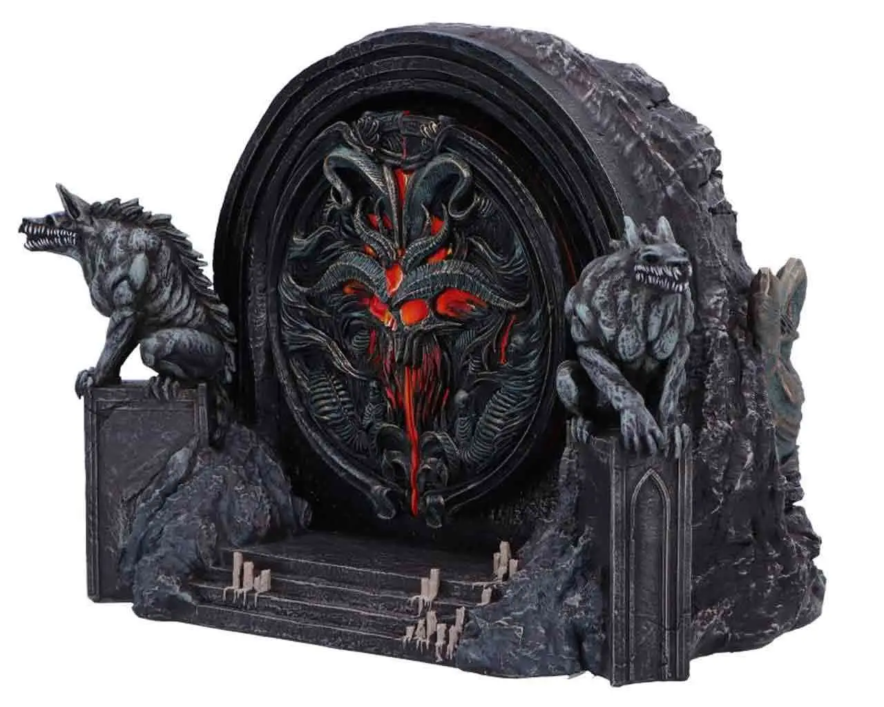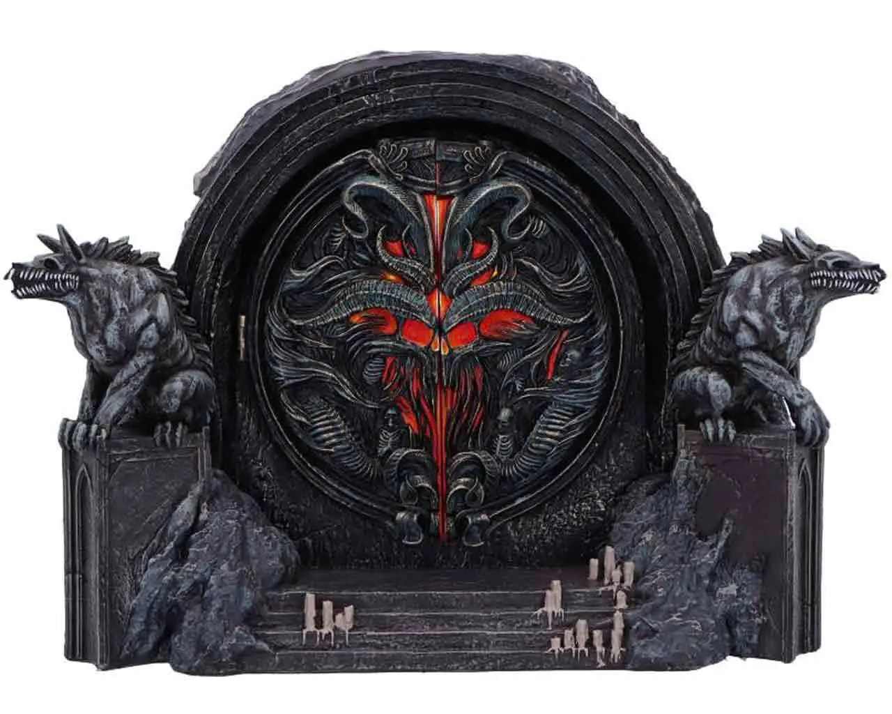 Questo stupendo diorama dei Cancelli degli Inferi di Diablo IV misura circa 16×22 cm, è realizzato in resina ed è completamente dipinto a mano. Le porte apribili rivelano un scompartimento ideale per conservare gioielli, dadi o piccoli oggetti.