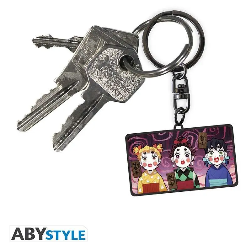 Questo portachiavi di ABYstyle raffigura Tanjiro, Zenitsu e Inosuke nei loro travestimenti mentre si preparano per un’azione sotto copertura nell’arco narrativo di Demon Slayer nell’Entertainment District.