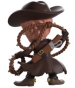 You can run, but there’s no way you’re gonna escape! The Ghoul has tracked Youtooz across the wasteland for his new figure! Standing at 4.2 inches tall and spinning a dark brown lasso that’s covered in shards of glass over his shoulder as he holds onto its end in a looped bundle, sunken eyes look out from his withered, gaunt face underneath the wide brim of his brown hat. Wearing a long brown duster coat that flicks out at the ends over dark pants and spurred boots, a pair of belts wraps around his waist as the bandolier across his chest secures a rifle to his back. The exterior of his packaging looks up at the glistening Lucky 38 Casino, while the interior is filled with dark brown wood panelling. The protective sleeve then sees a brown silhouette of the treacherous wasteland as his figure can be seen through the large, clear window at the packaging’s front. This collectible ships in a matte, embossed, protective outer sleeve and a custom-sized plastic protector for maximum protection during shipping.