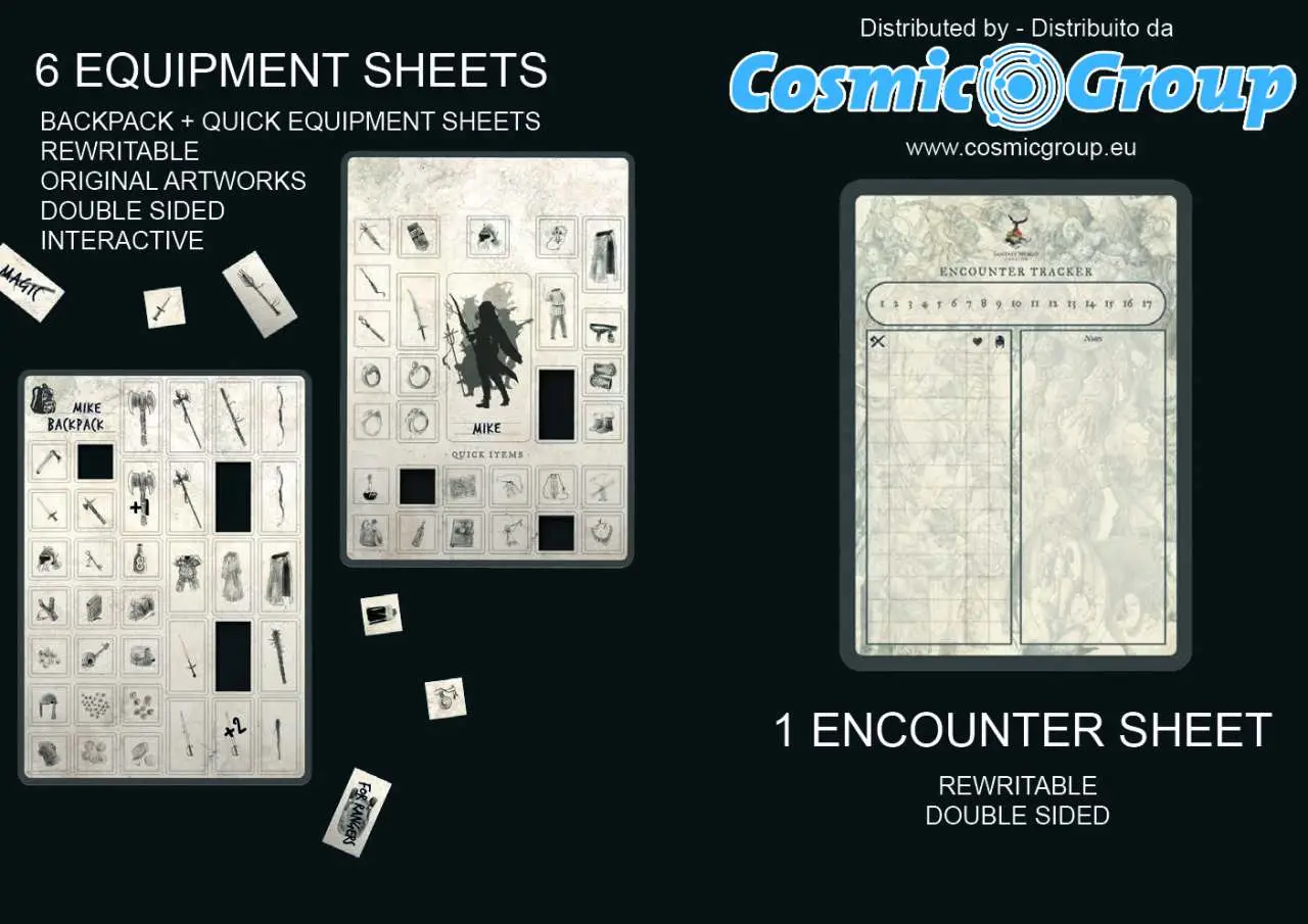 57 Pedine personaggio Stand-up (44 pedine PG e PNG, 9 pedine creature enormi, 4 pedine creature giganti) e basette.