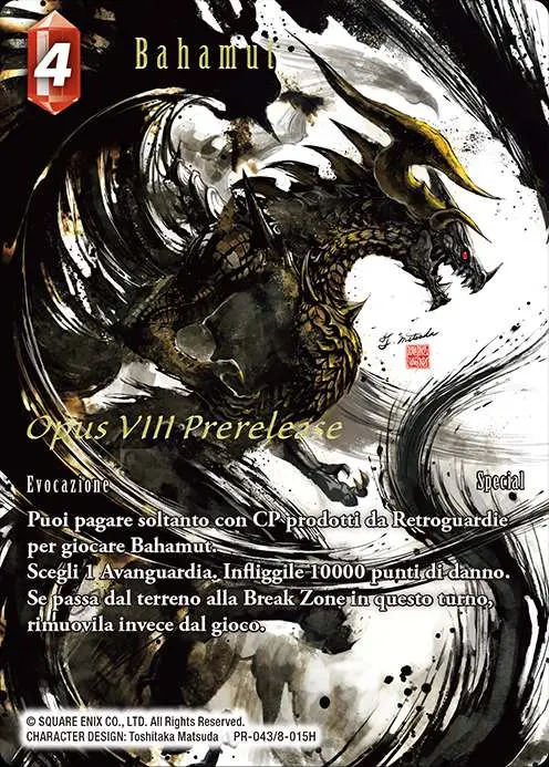 I kit per ogni giocatore conterranno 6 bustine di Opus VIII in italiano, una promo card esclusiva e un pacchetto di sleeves esclusivo che non verrà mai messo in vendita, entrambe con il Bahamut.