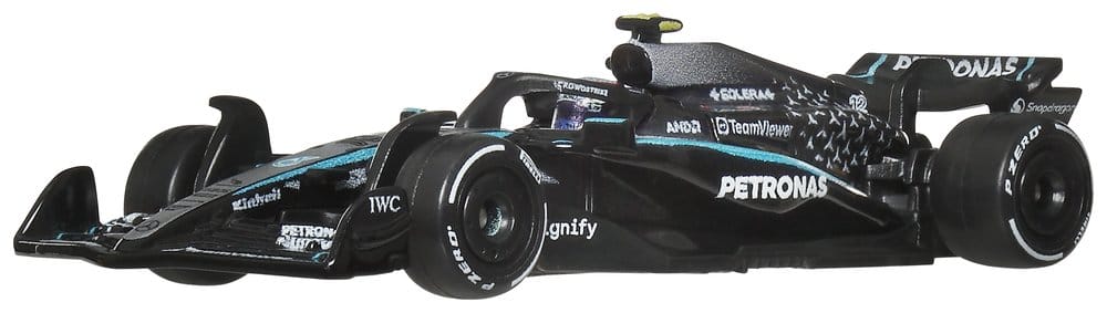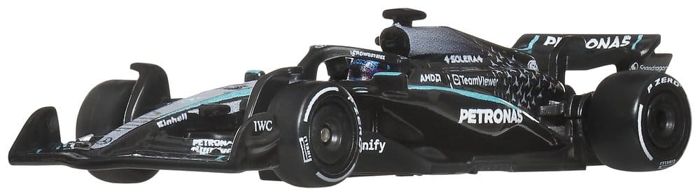 With this Hot Wheels Premium Mercedes-AMG PETRONAS F1 Team 2-Pack, any Hot Wheels collection shifts into turbo gear. The set includes 1:64 scale die-cast race cars inspired by the models driven by George Russell and Kimi Antonelli. Each car features authentic liveries with realistic front wings and side pods, as well as detailed driver helmets. The metal body and chassis, along with Real-Riders tires, highlight the high-quality craftsmanship of the cars. With special packaging and an individual display base, both drivers score points. Color and design may vary.