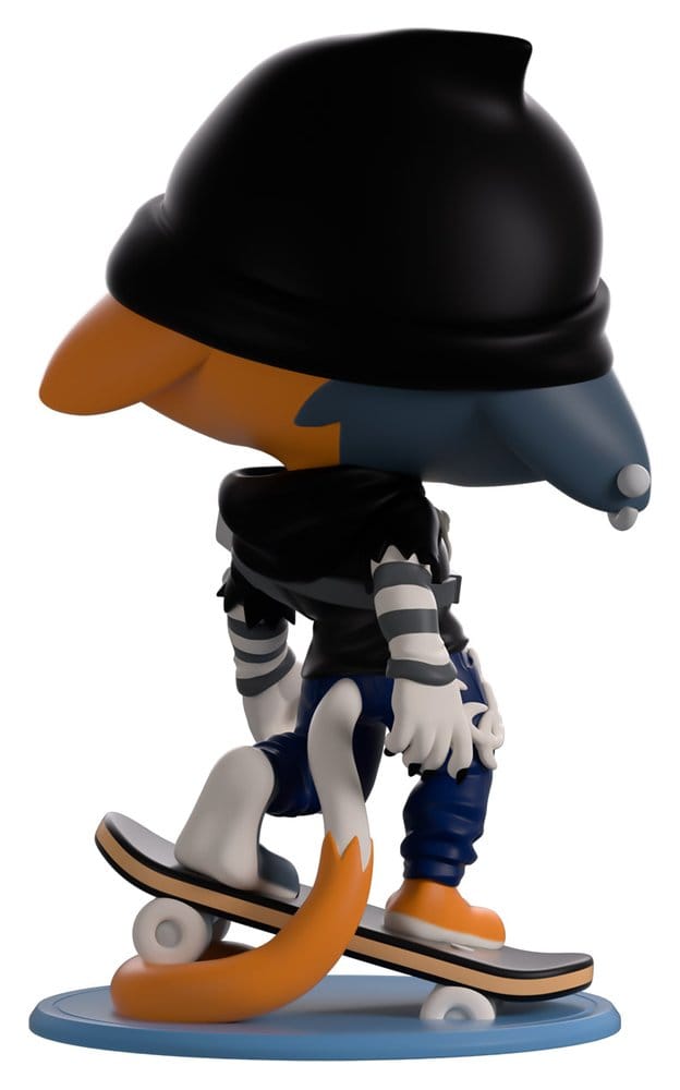 Looking for the chillest duo partner around? Because Meow Skulls is taking it reaaalllll easy with their Youtooz debut! Standing at 4.9 inches tall on top of a skateboard that’s propped up by the end of her long orange-tipped tail, a sneaky smile rests on her blue and orange calico face underneath dark, half-lidded eyes as a black beanie makes her pointed ears flop down. Dressed in a grey and white striped shirt under a black hoodie with torn sleeves, fishbone chains hang from her chest and hip as a harness with cans wraps around her torso, and she wears ripped blue jeans. The exterior of their packaging sees them shredding on a blue guitar in front of a rainbow tornado, while the interior is covered in a purple to pink gradient. A white streak then blasts across the purple protective sleeve as their figure can be seen through the large, clear window at the packaging’s front. This collectible ships in a matte, embossed, protective outer sleeve and a custom-sized plastic protector for maximum protection during shipping.