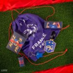 Officially licensed advent calendar with 24 French Football Federation themed gift items (Eraser, drawstring bag, captain band, acrylic stand, luggage tag, glass pouch, washi tape, socks, pen with pin, bucket hat, 3d keychain, microfiber cloth, lenticular pin badge, pop socket, lenticular sticker, pin, socks, headband, shoe bag, phone ring, foam magnet, lock, bottle opener, shoe lace)