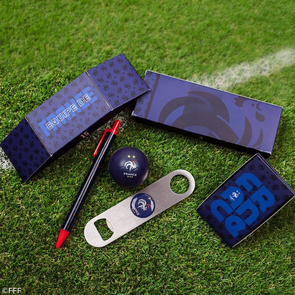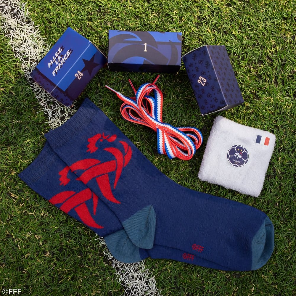 This is a Jersey Advent Calendar for the French Football Federation (FFF), manufactured by Cinereplicas. It contains 24 items including Mini Squishy, Shoelaces, Socks, and more.