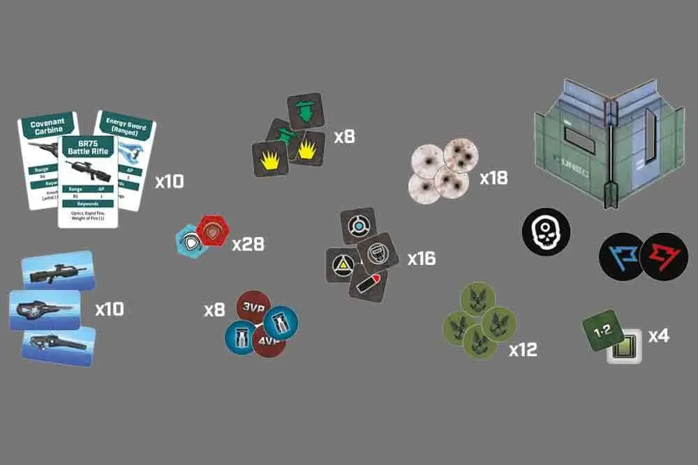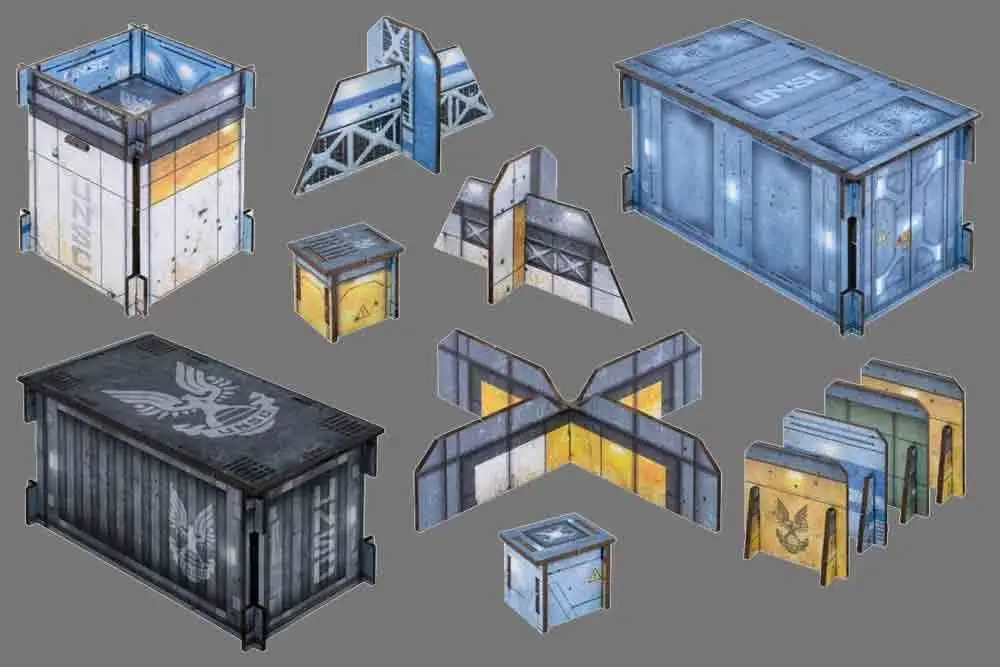 Il Set di Terreno Base UNSC contiene: 13 elementi scenici in cartone pre-colorato, 107 segnalini in cartoncino, 10 carte Arma da raccogliere