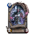 Classic elements such as Attack value, Health value, and Rarity adorn the surface of the statue, while the Battlecry is expertly etched at its base, faithfully recreating the original card design. The reverse side recreates the “Tyrande” card back, with the central Hearthstone swirl glowing softly, complementing the ancient, carved stone textures surrounding it.