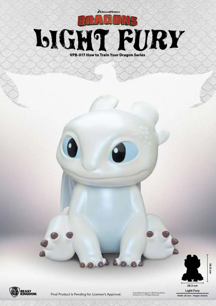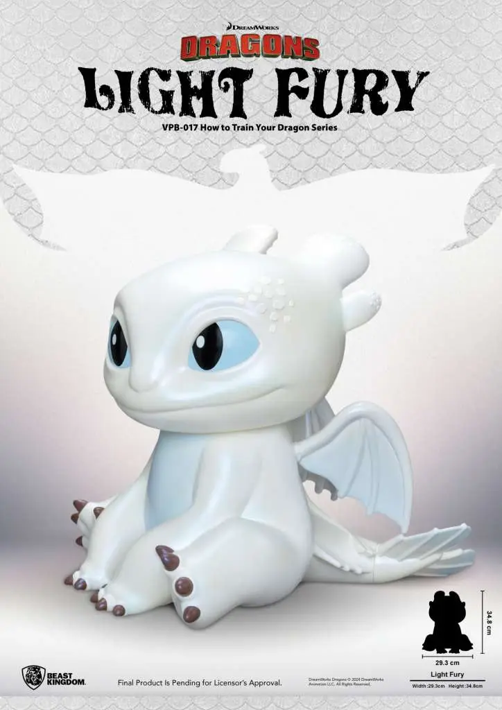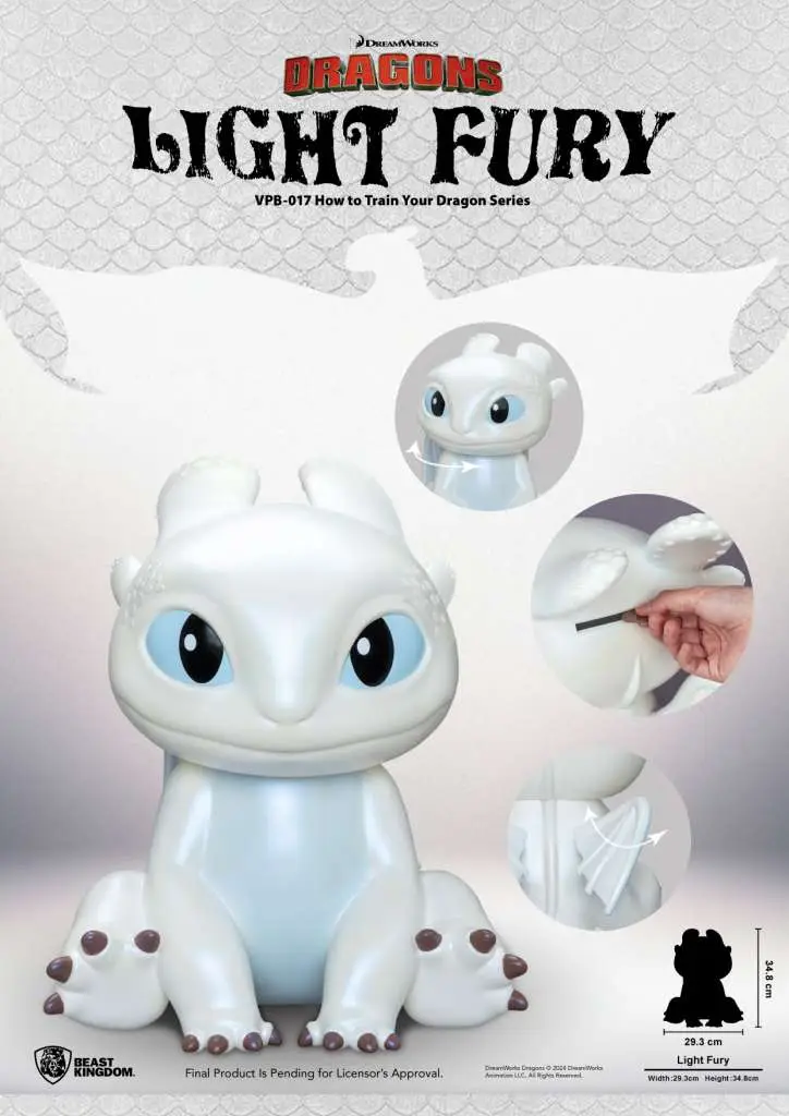 È il primo amore di Sdentato, lo straordinario drago bianco chiamato Furia Chiara. In “Dragon Trainer: Il mondo nascosto” Furia Chiara ha bellissime scaglie bianche e occhi azzurri. Il suo fascino e la sua natura giocosa conquistano Sdentato e insieme creano una famiglia. Dopo il salvadanaio in vinile “Sdentato”, Beast Kingdom offre ora il salvadanaio “Furia Leggera”. Questa nuova statuetta funzionale presenta scaglie lisce e placche in corno morbido. I suoi occhi e il suo sorriso incantevoli ti faranno venire voglia di risparmiare i tuoi soldi con lei. Porta Furia Leggera a casa perché sia la tua compagna salvifica!
