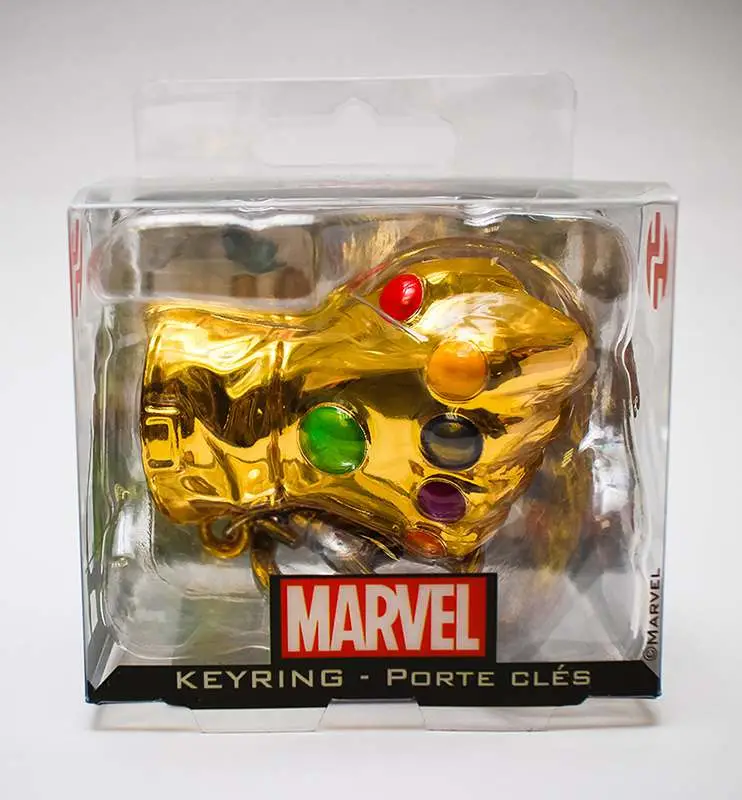 Da Semic il portachiavi in metallo raffigurante il Guanto dell'Infinito, confezionato in una scatola in plastica trasparente.