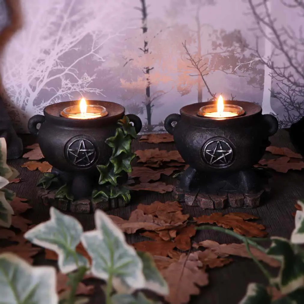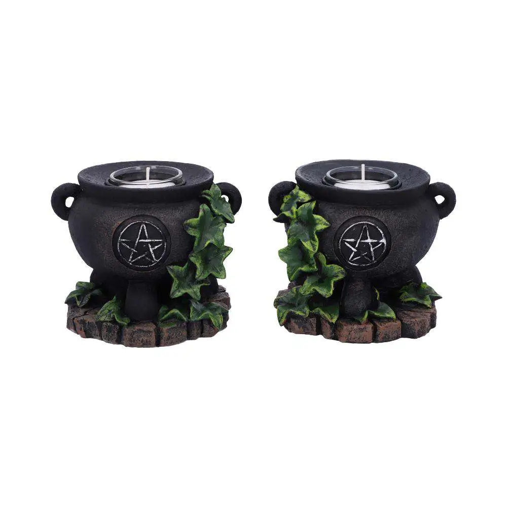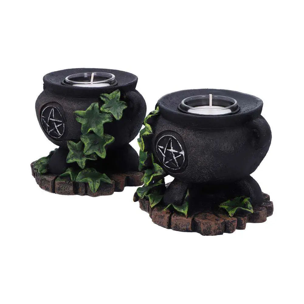 Questo set di due piccoli calderoni portacandele e' il sogno di ogni appassionato di occulto. Con un piccolo portacandele in vetro, questi calderone hanno una finitura nera opaca e un pentacolo argentato al centro. Ricoperti lateralmente da rami di edera rampicante e realizzato in finissima resina, questi oggetti sarebbero l'aggiunta perfetta a qualsiasi altare oscuro.