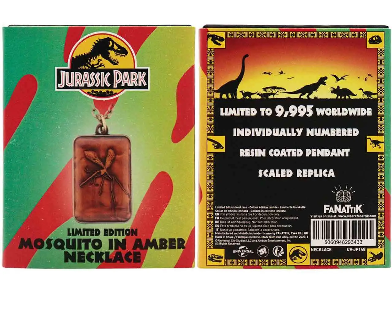 Tornate indietro nel tempo, recuperate un pezzo dell’isola di Isla Nublar e possedete una replica dell’antica zanzara utilizzata per ricreare i dinosauri. Con dimensioni di 32 mm x 21 mm, questa collana unisex in ambra con zanzara in edizione limitata è un pezzo dettagliato e numerato singolarmente. Limitata a 9.995 esemplari in tutto il mondo.
