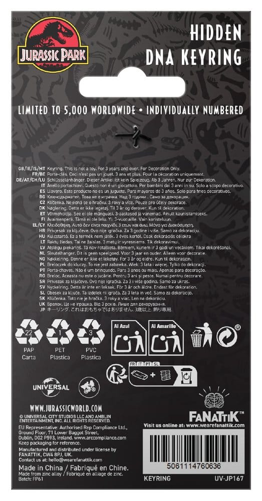 The most famous can of shaving foam ever, this limited edition pin badge recreates the Barbasol product which slides open from the bottom to reveal dinosaur embryo storage chambers, as given by Dodgson to the nefarious Dennis Nedry, for him to attempt to steal from his Jurassic Park boss John Hammond. Individually numbered to the reverse of the sliding portion, each keyring is limited to 9,995 worldwide and features enamel and UV print to the front.