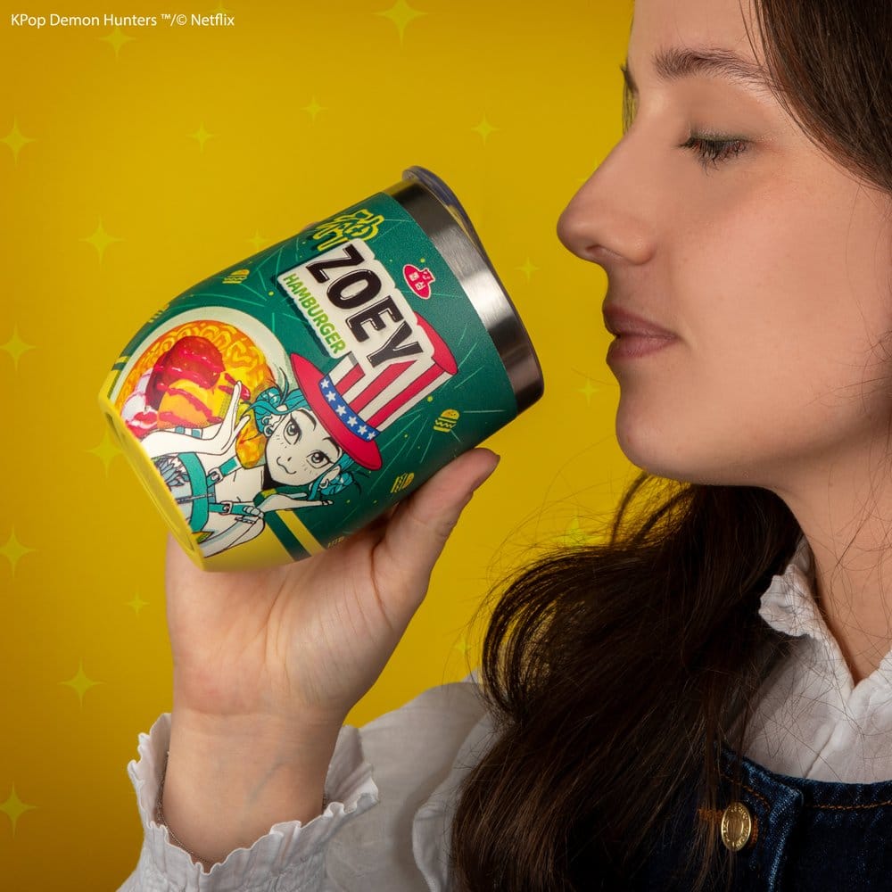 This KPop Demon Hunters Travel Mug Zoey Hamburger is an officially licensed product from Cinereplicas. The body is made of stainless steel and the lid is plastic.