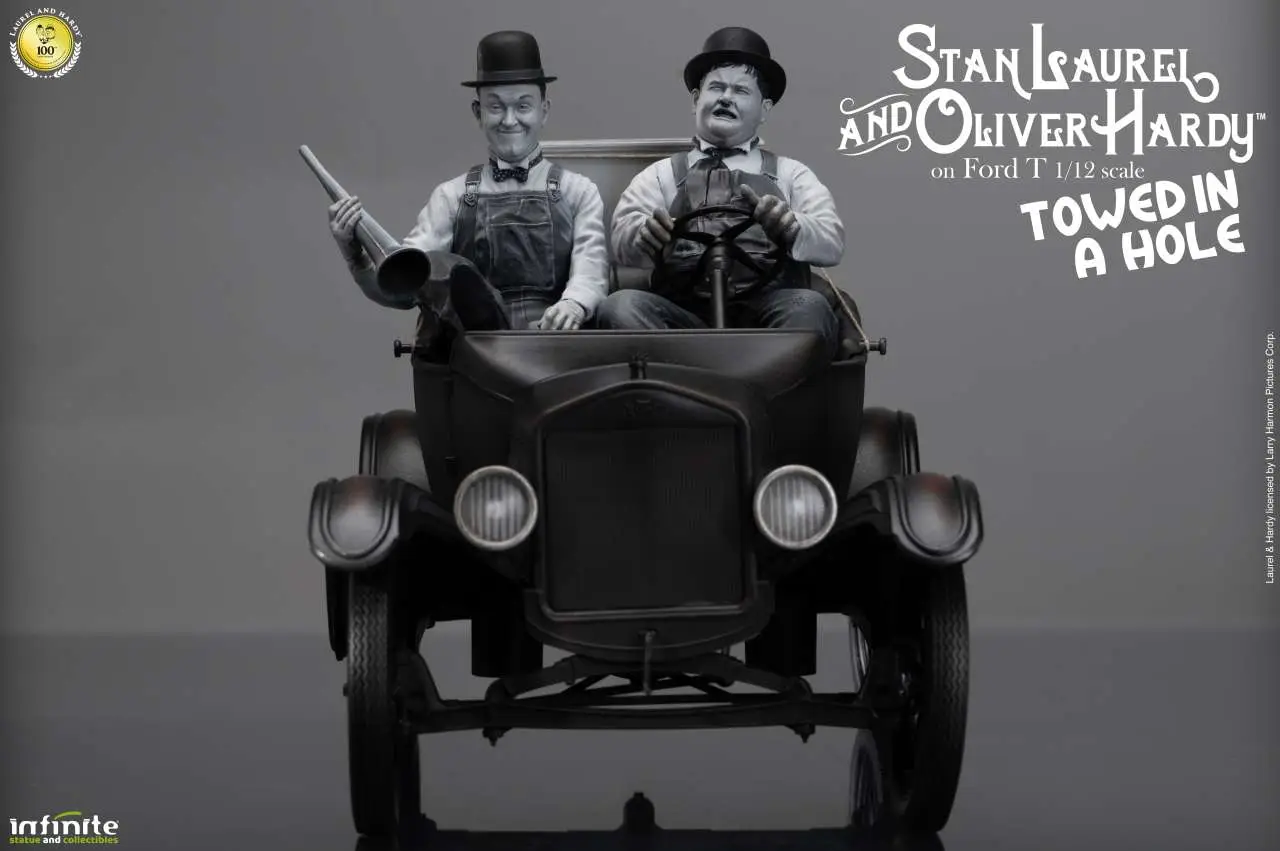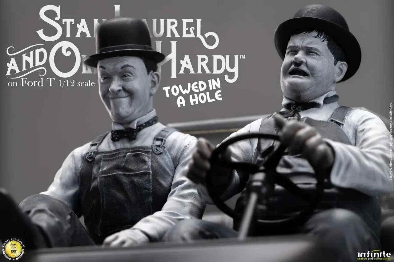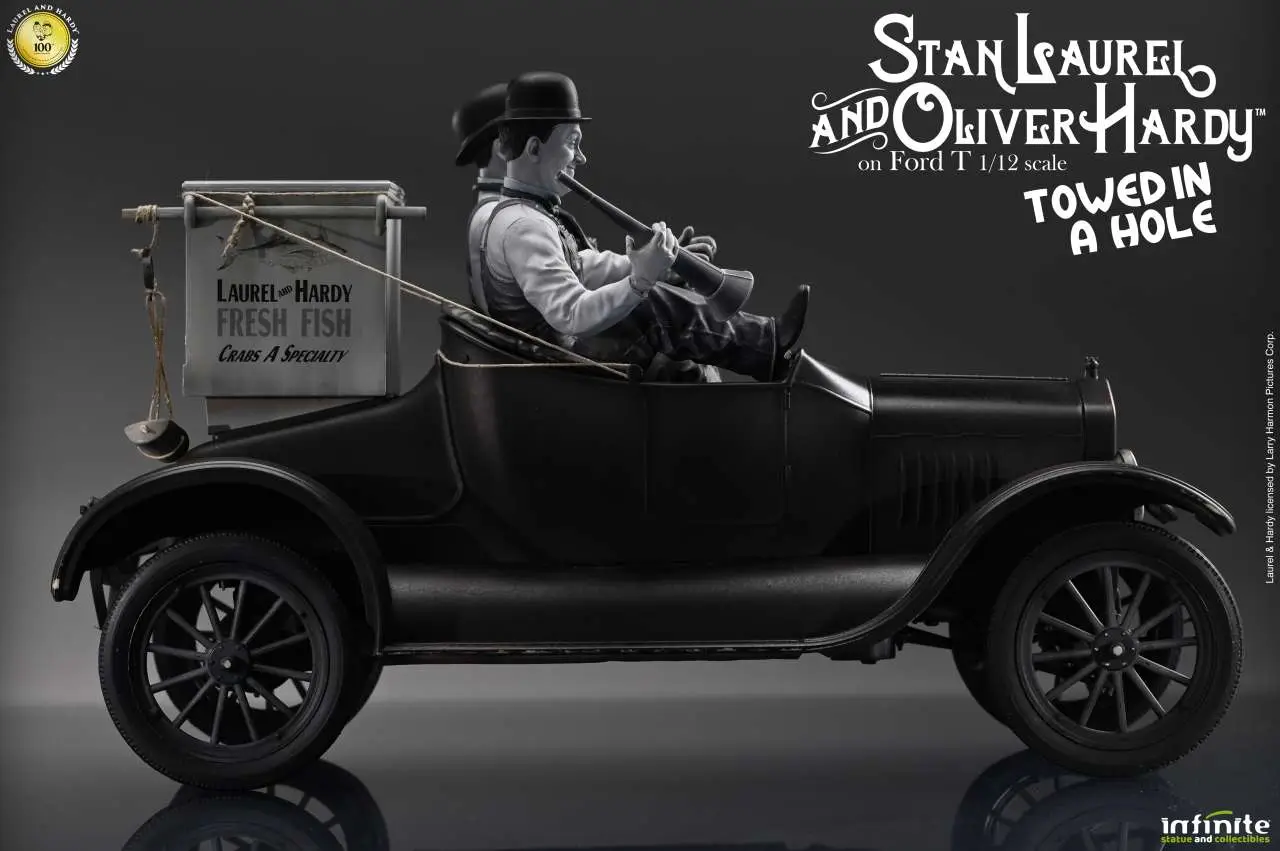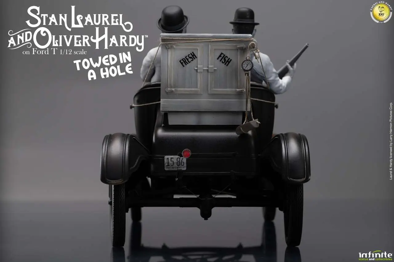 Nuova statua da collezione in scala 1/12 dedicata a Stan Laurel & Oliver Hardy, ispirata al celebre cortometraggio Towed in a Hole del 1932. La scena raffigura i due iconici personaggi sulla loro Ford Model T modificata, utilizzata per la vendita ambulante di pesce porta a porta, circondati da casse, attrezzi e oggetti accuratamente scolpiti.