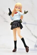 From the military high school girl series “Little Armory” comes unnamed character F in a new style! This figure includes black equipment parts and a cloth skirt with a camouflage pattern. Featuring a black equipment color scheme that is mainly used by special forces for its intimidating effect and low visibility at night. Variant F features long straight hair, a first line belt, and loafers, resulting in a minimalistic configuration. Hair and eye colors have been changed, allowing you to enjoy an even greater variation of display options when paired with past entries in the series. The figure comes with an M45 type automatic pistol that can be stored in the included holster.