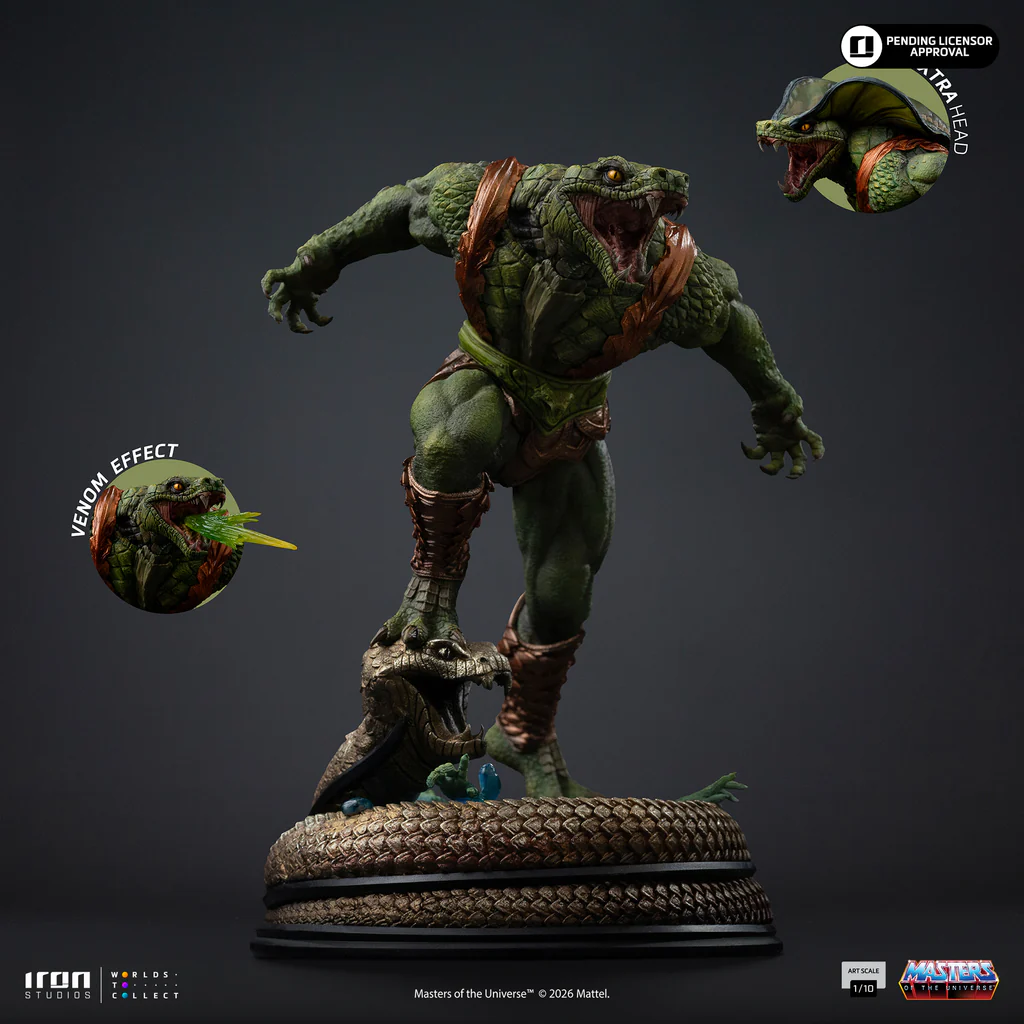 Kobra Khan rappresenta uno dei villain storici del franchise He-Man and the Masters of the Universe. Membro della fazione rettiliana e alleato strategico di Skeletor, il personaggio è celebre per le sue abilità serpentiformi e il gas paralizzante che lo rendono un avversario insidioso per i Difensori di Eternia. Questa statua cattura l’essenza del personaggio attraverso una posa dinamica e un design che rispetta fedelmente l’estetica classica del brand.