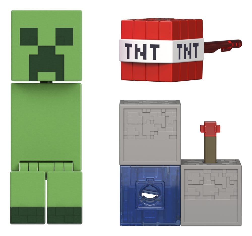 All the fun of Minecraft can be captured with these action figures, which are true to scale at approx. 8 cm, and accessory sets. Each of the authentic figures includes an iconic accessory from the game and 1 Redstone component. The components from the six collectible figures can be used to build a functional Redstone TNT cannon. The figures have movable joints, offering even more possibilities for storytelling. All items sold separately. Subject to variations in color and design.
