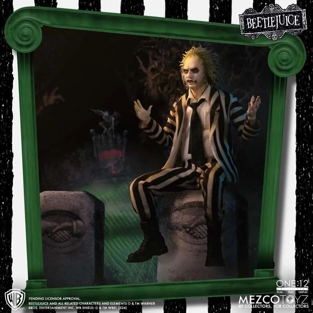 L’irriverente Beetlejuice, dall’ultima fatica cinematografica di Tim Burton, arriva nella serie One:12 Collective! La figura è del tutto simile al personaggio visto al cinema ed è dotato di articolazioni e abiti in vera stoffa. Nella scatola troverete anche mani e volti intercambiabili, lapide con effetto light-up, base con logo, libro e altro ancora!