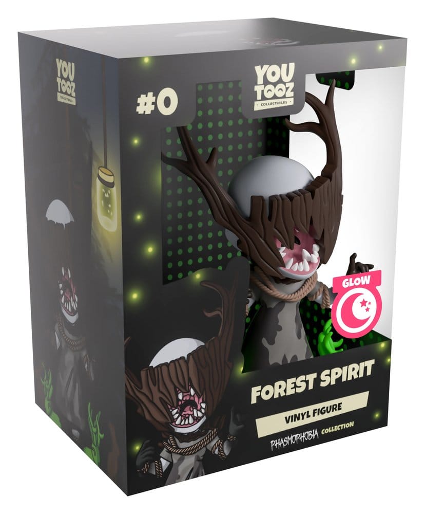“The Cursed Hollow Begins!” It’s time for a new event! So you’d better start searching for clues because the elusive Forest Spirit is haunting Youtooz! Standing at 5.3 inches tall with dark hands motioning to the front and a jagged wooden mask covering their face with spiked branches reaching out from the top to mimic horns, sharp teeth line their terrifying open pink mouth as brown ropes wrap around their shoulders, arms and legs. Wearing a grey dress with dark splotches running up either side as dark branches cover their chest and curl out from their back, a pair of ghostly green minions rest by their feet with long horns curling out from the top of their rabbit heads. The exterior of their packaging sees wooden charms hanging in front of shadowy trees, while the black interior is filled with pulsing green dots. The protective sleeve then sees them stalking through a pale lit forest as their figure can be seen through the large, clear window at the packaging’s front. This collectible ships in a matte, embossed, protective outer sleeve and a custom sized plastic protector for maximum protection during shipping. About Phasmophobia Phasmophobia is a paranormal psychological horror game developed and published by Kinetic Games. Letting players work by themselves, or in a team with up to 3 others, they must complete contracts and identify the type of ghost haunting each location while keeping their sanity in check and not dying!