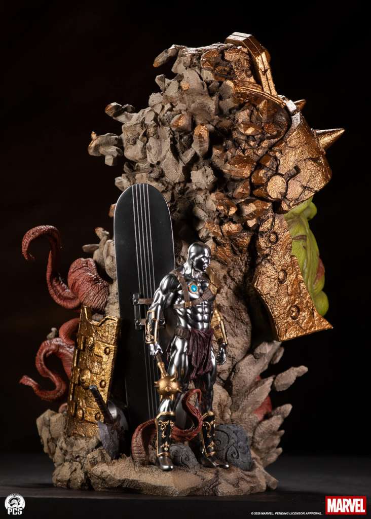 Alto 56 cm, questo pezzo da collezione assolutamente unico mette al centro un ritratto stoico dell’eroe esiliato, che si fonde gradualmente in una superficie rocciosa, evocativa della dura terra del pianeta di battaglia, Sakaar. Attorno al busto si sviluppa una scena che raffigura Hulk in pesante armatura mentre affronta un feroce “Devil Corker”, un magnificamente dettagliato e interamente corazzato Savage Surfer, oltre a una selezione di armi e armature utilizzate nel loro iconico scontro gladiatorio.