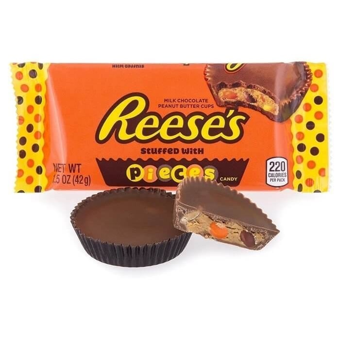 Reese’s Peanut Butter Cups with Reese’s Pieces sono due coppette al cioccolato al latte e cremoso burro d’arachidi Americano, con all’interno confetti di cioccolato e burro di arachidi. E tu cosa aspetti? Scopri Reese’s Peanut Butter Cups with Reese’s Pieces!