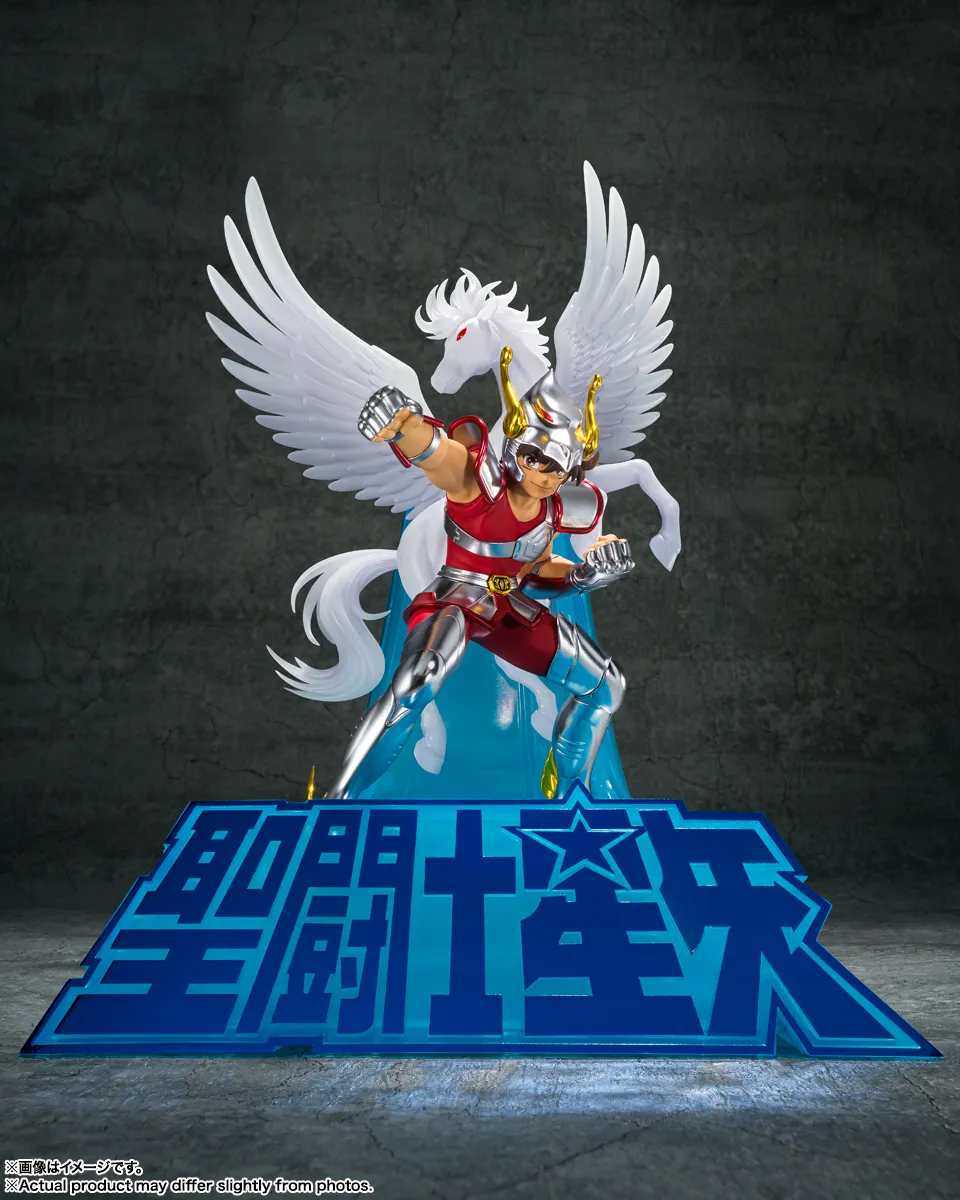La base espositiva richiama la celebre rappresentazione del logo di Saint Seiya vista nell’opening, mentre alle spalle di Seiya è raffigurato il simbolo del Pegaso, per un forte impatto scenico.