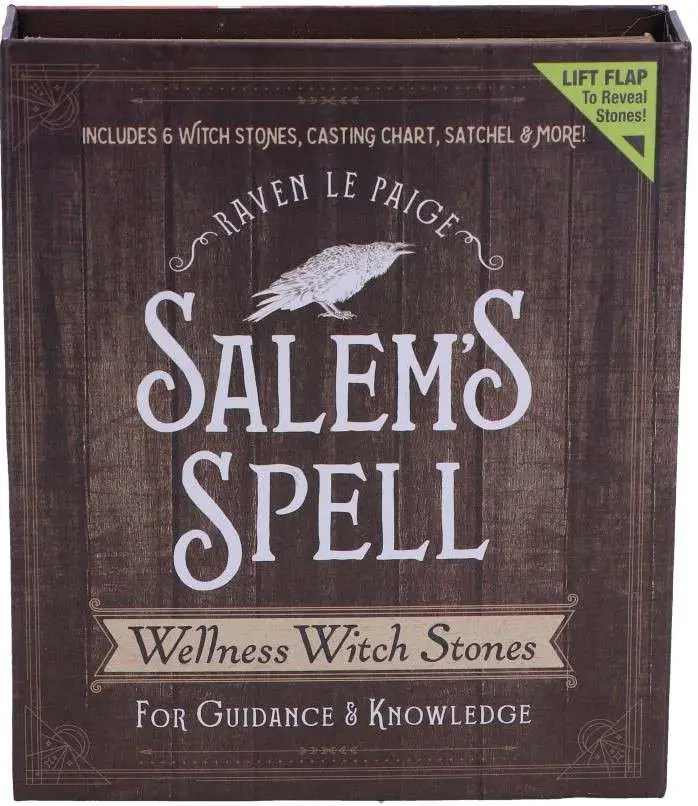 Questa scatola e' la chiave per il benessere delle streghe. Sulla parte anteriore della scatola c'e' scritto -Wellness Witch Stones, For Guidance and Knowledge-. Dopo aver aperto il coperchio anteriore della scatola, si troveranno 6 piccole pietre (Agata grigia, Quarzo rosa, Unakite, Avventurina gialla, Avventurina chiara e Agata brasiliana), ciascuna con proprieta' simboliche diverse. La scatola contiene anche una borsa per il trasporto, una tabella di colata del pentacolo e un libretto di istruzioni per aiutare te e gli altri a ricevere una guida ispirata e svelare la conoscenza nascosta.