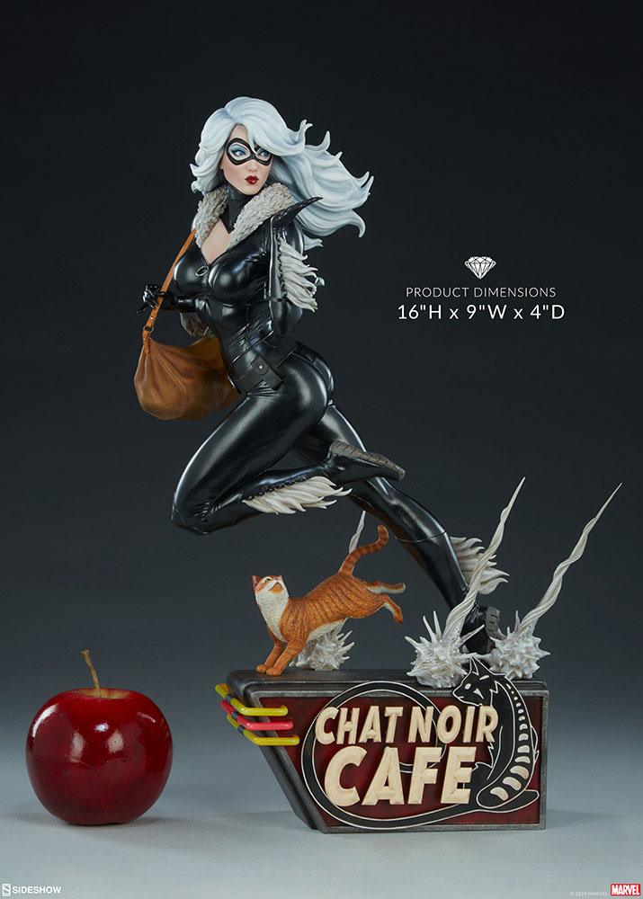 La statua di Black Cat misura 41 cm di altezza mentre la felina femme fatale si allontana velocemente, mandandole un bacio sopra la spalla mentre Spider-Man le resta caldo sulla coda. Schivando le ragnatele che le vengono incontro, Felicia si imbatte in una base a tema Chat Noir Café mentre il suo compagno gattino lo segue.
