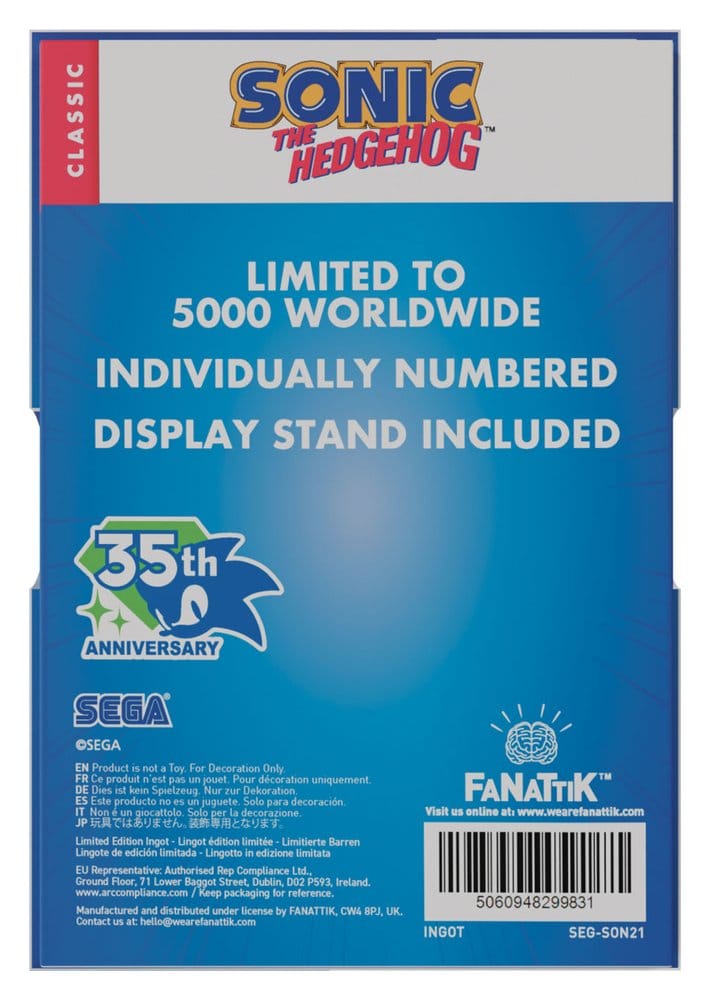 Arch-nemeses, good vs evil, Sonic vs Eggman has been a battle for ages, and you can commemorate that battle with this limited edition ingot in the style of a stained-glass window. Measuring 10,0 x 6,0 cm, the ingot is limited to 5,000 worldwide and individually numbered to the reverse. Each one comes with an acrylic display inside its presentation box.