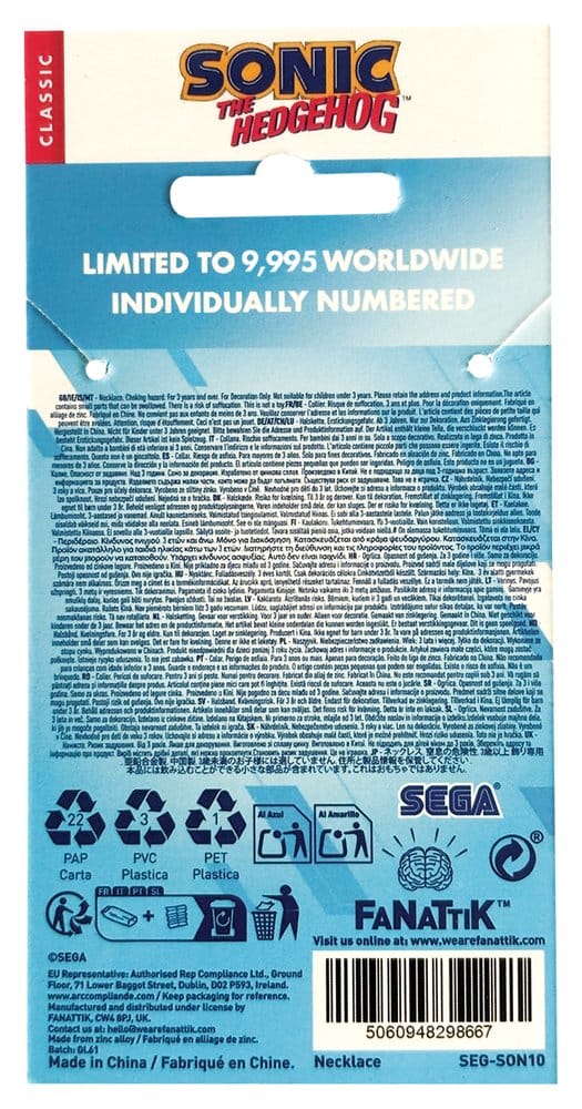 “Rings are synonymous with Sonic the Hedgehog, with him collecting them in almost every game in which he has appeared. This limited edition necklace represents that connection by featuring a pixelated version of the blue speedster inside a ring finished with gold plating. Individually numbered to the reverse of Sonic, the necklace is limited to 5,000 worldwide.