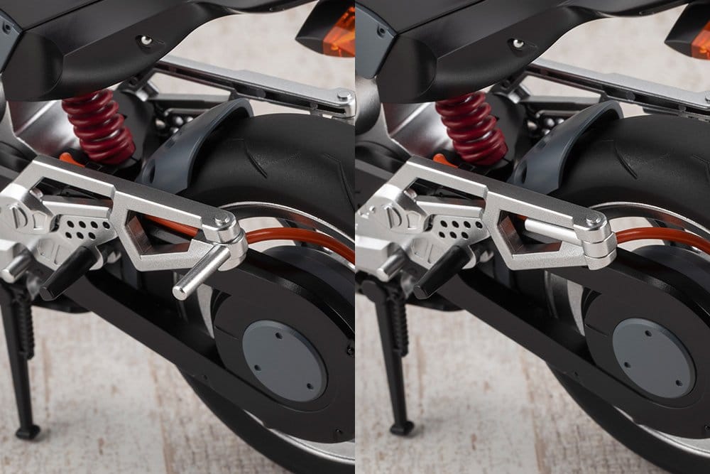 A highly versatile black color that can be used in any scene! A color variant of the Extreme Sports Bike joins the Kotobukiya exclusive lineup. A first for Kotobukiya’s original bike lineup, this is a standard, non-combat motorcycle. However, thanks to designer F, who also designs Megalomaria and M.S.G, it pairs exceptionally well with various series. At 1/10 scale, the total length is approximately 195mm. Sized to be ridden by character models with a total height of about 160mm, impactful scenes can be created by combining it with kits such as Maria Kagaribi [Dress Code] or Emulator from the Megalomaria series. Enjoy this snap-fit bike kit that is just as easy to assemble and enjoy as character model kits! *Rui Saotome?Touou High School Tracksuit?Dreaming Style Midnight Onyx requires the use of the riding body to board the bike. Features: The handlebars and tires are linked, allowing the steering angle to be changed. The tires can also freely rotate, allowing for manual rotation. The tandem steps at the rear of the vehicle can be deployed. In addition, a 3mm connection point is located at the bottom of the vehicle’s body, allowing it to be displayed using the separately sold Flying Base. Full-Face Helmet: By pulling out the top part of the helmet and the internal base, separately sold Sousai Shoujo Teien face parts can be used. This allows the expression to be changed to various compatible characters, such as Rui Saotome. The visor can be opened and closed. It is molded in clear plastic so that the attached face part can be easily seen. The interior of the helmet was meticulously sculpted to match the bangs and nape of Rui. It is compatible with Megalomaria (female body type) face parts, allowing for various combinations. The skin tone at the neck uses Skin Color C, allowing the face parts of a wide range of characters to be attached. *Regarding helmet compatibility: Sousai Shojo Teien’s Ao Gennai and Bukiko Kotobuki use unique standards so they are not compatible with the helmet. *The helmet is the same as that included with Rui Saotome?Touou High School Tracksuit?Dreaming Style Midnight Onyx. Gloves: Three types of gloved hand parts are included: Open, Closed, and Gripping Handlebars. These hand parts can be attached kits from the Sousai Shoujo Teien series and Megalomaria series. Coloring: Bike: Black 1, Black 2, Gray, Smoke Gray, Clear Turquoise Green, Clear Orange, Clear Red, Orange, Red, Silver Full-Face Helmet: Black, Clear Black, Skin Color C, Milk Tea (Hair Color) Gloves: Gray