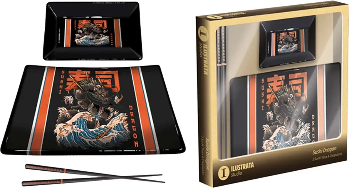 Goditi del gustoso sushi con questo meraviglioso set, composta da un grande piatto piano, una ciotolina per la salsa di soya e due bacchette in tinta. Piatto e ciotola sono realizzati in ceramica di colore nero e arricchiti dall'artwork del famoso Illustrata Studio con maestoso Sushi Dragon! Un divertente omaggio ai classici film di Kaiju. Attenti al Drago!