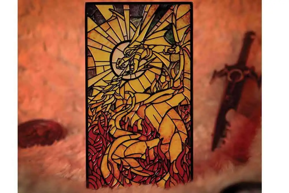 Akatosh, divinità capo dei Divini, è il Dio Drago del Tempo ed è citato in tutti i giochi di The Elder Scrolls, compreso The Elder Scrolls IV: Oblivion, ed è raffigurato su questo lingotto nello stile di una vetrata. Misura 100 x 56,8 mm, è rifinito in nichel nero con dettagli colorati e viene fornito con un supporto da esposizione all’interno della sua scatola di presentazione.