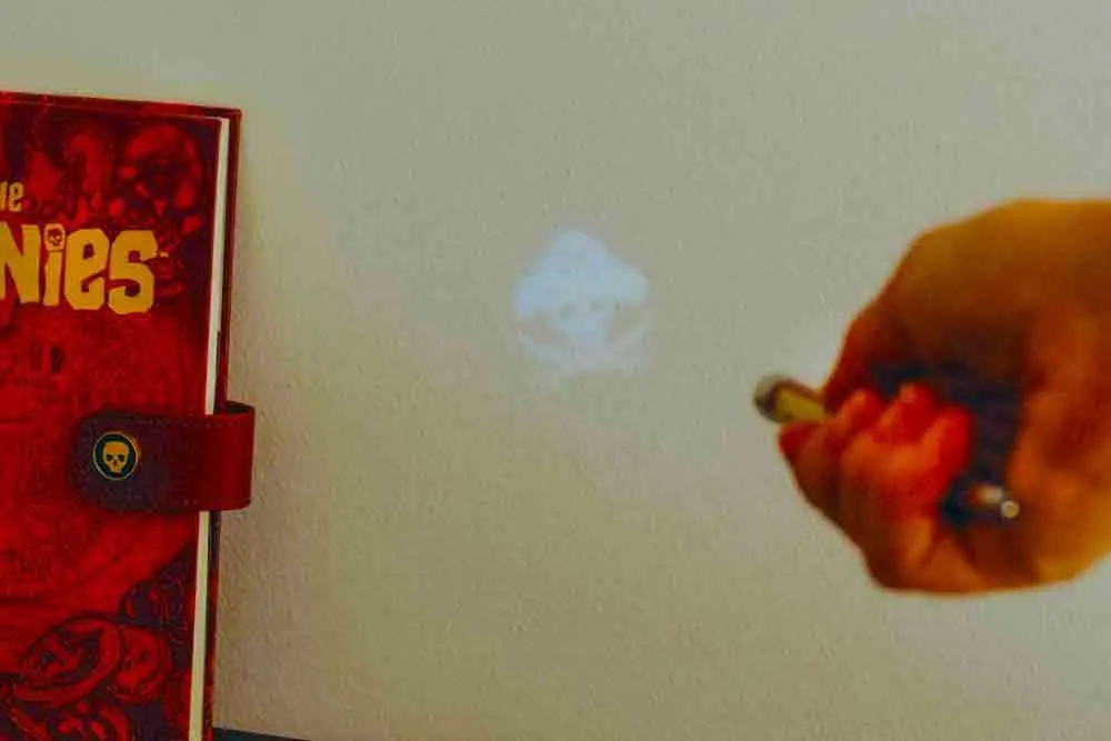Questo notebook A5 (14,8 x 21cm), presenta una copertina rigida resistente, bordi arrotondati e chiusura a scatto per tenere al sicuro il suo interno. Dettagli in rilievo con rifiniture dorate. 192 pagine di carta qualità premium da 100 g/m². Include una penna con luce che proietta la Jolly Roger di Willie l’orbo !