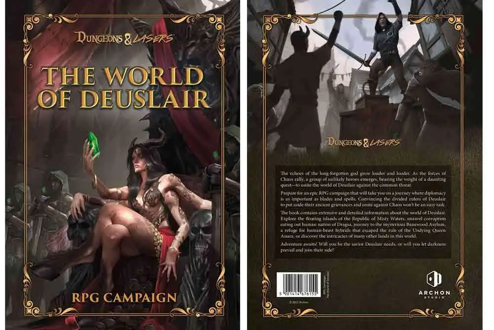 Il libro contiene informazioni ampie e dettagliate sul mondo di Deuslair. Esplorate le isole fluttuanti della Repubblica delle Acque Nebbiose, svelate la corruzione che divora la nazione umana di Dragsa, viaggiate verso il misterioso Ashylum di Banewood, un rifugio per gli ibridi umano-bestiali sfuggiti al controllo della regina Anara, o scoprite le complessità di molte altre terre di questo mondo. L’avventura vi aspetta! Sarete il salvatore di cui Deuslair ha bisogno o lascerete che le tenebre prevalgano e vi unirete al loro fianco? e vi unirete al loro fianco?