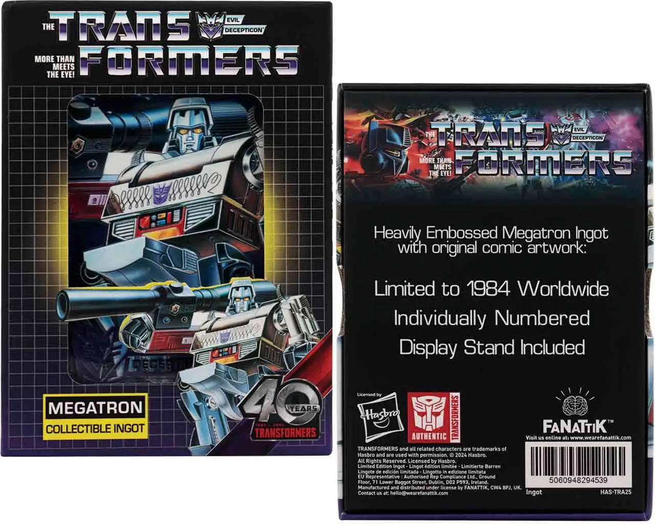 Questo lingotto in metallo, in edizione limitata, raffigura il malvagio leader dei Decepticon, Megatron, realizzato con smalto colorato in forte rilievo. Numerato singolarmente sul retro, ogni lingotto è uno dei 1.984 in tutto il mondo, a significare l’anno in cui siamo stati introdotti ai Transformers, misura 90×60 mm e viene fornito in una scatola di presentazione con espositore.