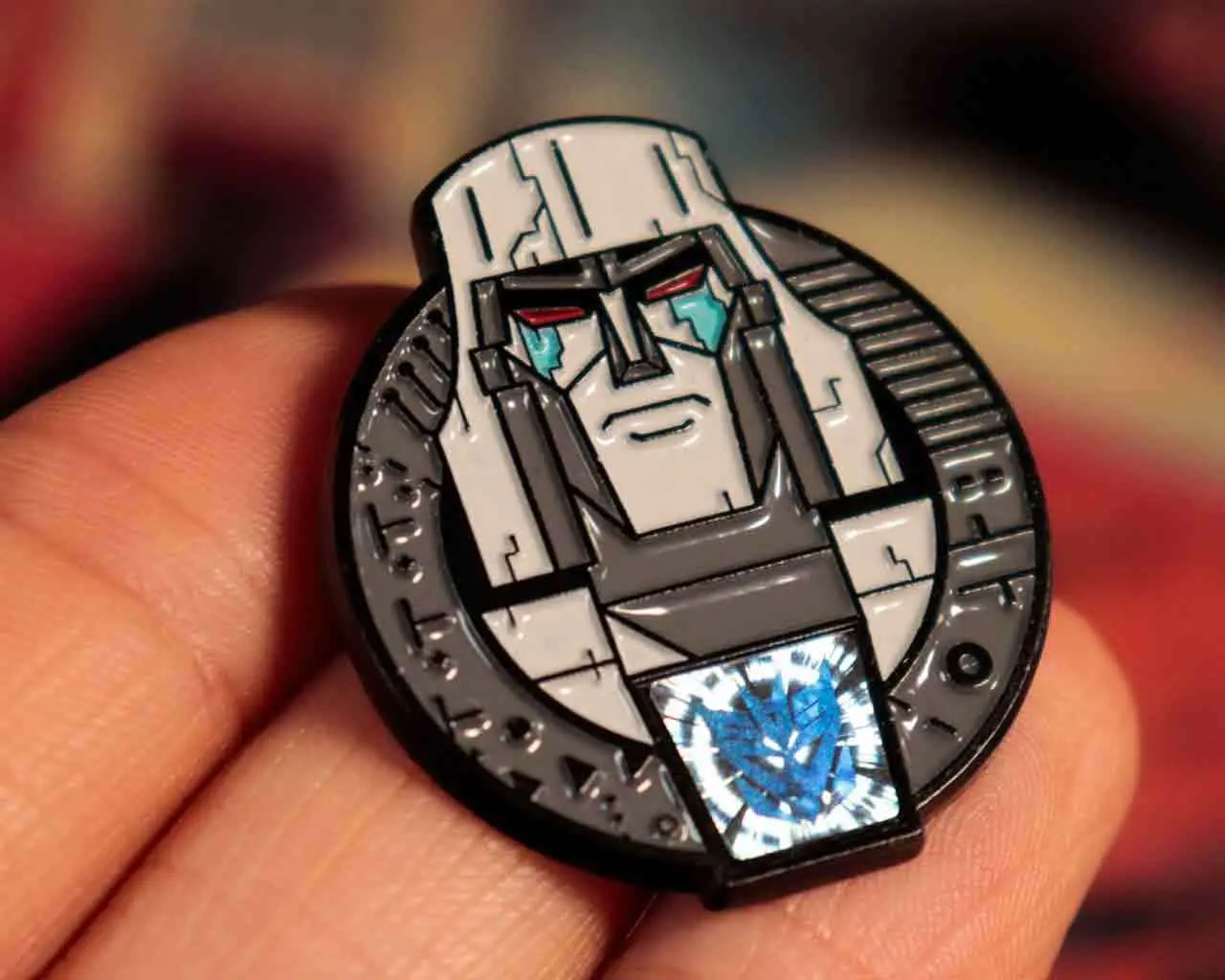 Amici che sono diventati nemici, Cybertroniani che sono diventati Transformers, Optimus Prime e Megatron sono stati ai ferri corti per 40 anni quest’anno, e per celebrare, Fanattik ha creato questa coppia di spille, una per ciascuno dei leader degli Autobot e dei Decepticon, con adesivi olografici su ognuno, che ricordano i giocattoli Transformers originali degli anni ’80! La scatola è numerata individualmente, poiché ogni set è un esemplare di soli 5.000 pezzi in tutto il mondo. Ogni distintivo misura 3O x 35 mm