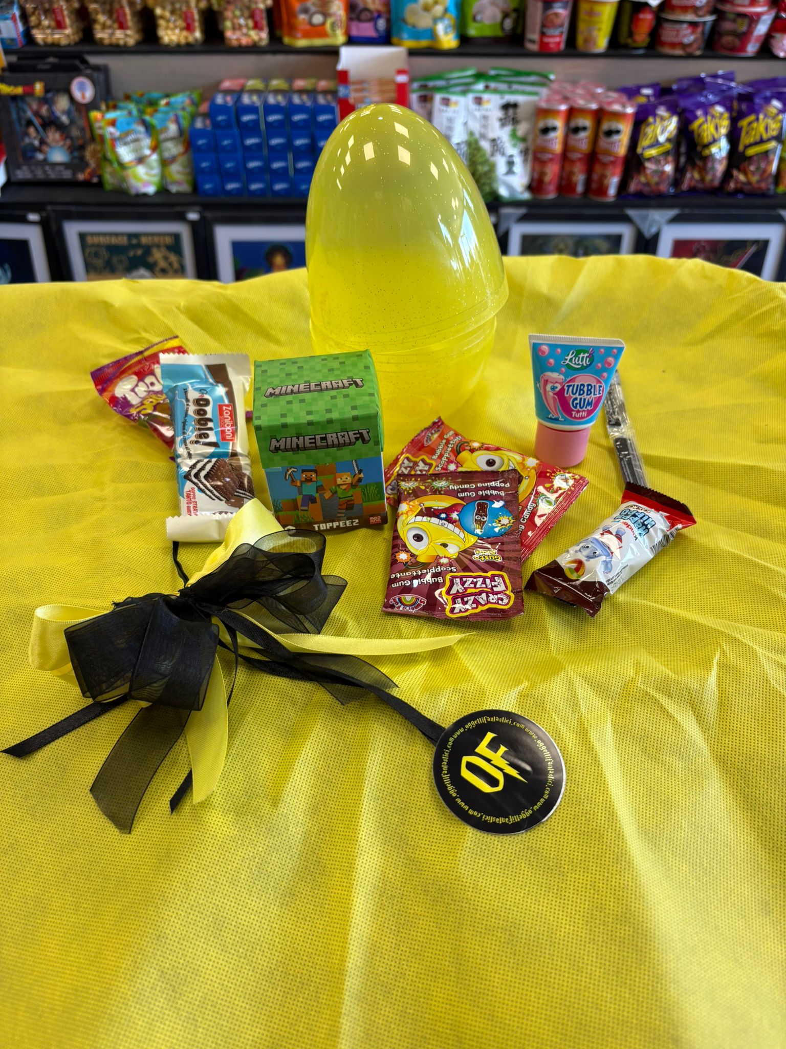 Ogni uovo è assemblato a mano nel nostro negozio e contiene un mix sempre diverso di sorprese, per rendere ogni confezione unica. Aprirlo significa scoprire uno dopo l’altro piccoli oggetti divertenti e gustosi.