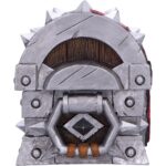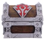 A durable resin build, engraved Horde emblem, painted silver and blood red accents, and a hinged lid that provides the illusion of a lock and key closure.