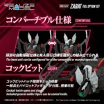 A deluxe version of RMZ-020 ZABAT featuring numerous additional parts. Its specially designed articulation allows full-body movement, enabling various action poses unique to bat-type Zoids, such as flight poses and hanging poses. The homing bomb stored in the abdomen is removable. The underside can be displayed with tires exposed or retracted. Additionally, it can be equipped with either triple anti-air missiles or a radome as optional parts. Also included is a hanger for displaying it in a hanging state and a base for displaying it in flight. The head can be assembled in either an autopilot mode or a manned flight mode. A pilot figure (soldier) is included and can be seated in the cockpit for the manned flight mode.”